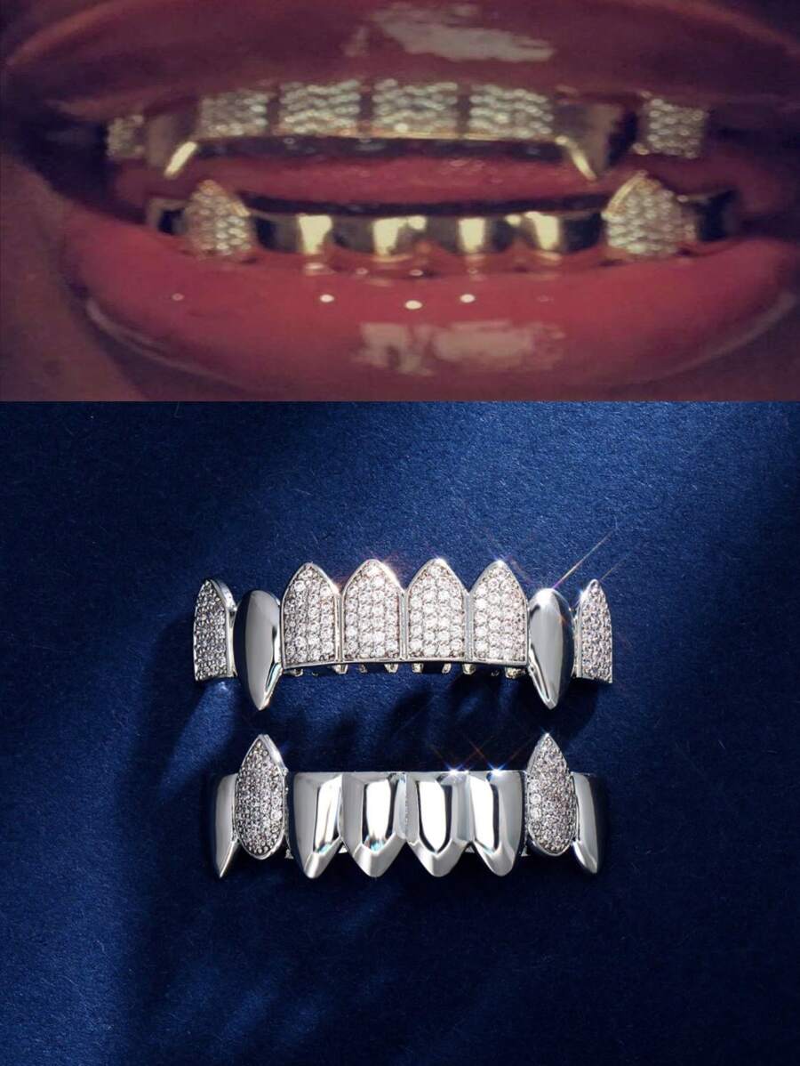 1-2件朋克嘻哈风格镀金铜锆石牙套,吸血鬼牙齿装饰,男女皆宜,适合日常佩戴和角色扮演派对