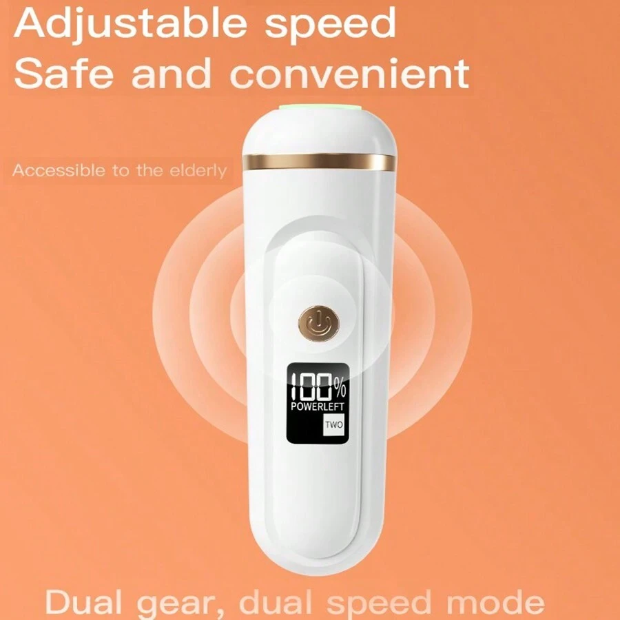 1個帶顯示屏的電動足磨刀; 玻璃磨頭,快速去除老茧,並具有更長的使用壽命; 悄音設計,無噪音電機具有強大的動力和長久的使用壽命; 兩種可調節的速度; 360度水平旋轉;