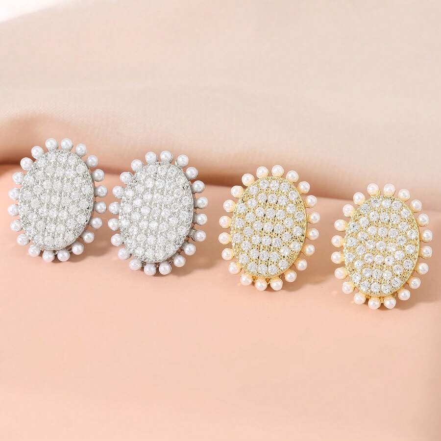 1对金色镶嵌锆石椭圆形迷你仿珍珠边夹式耳环 女士日常饰品