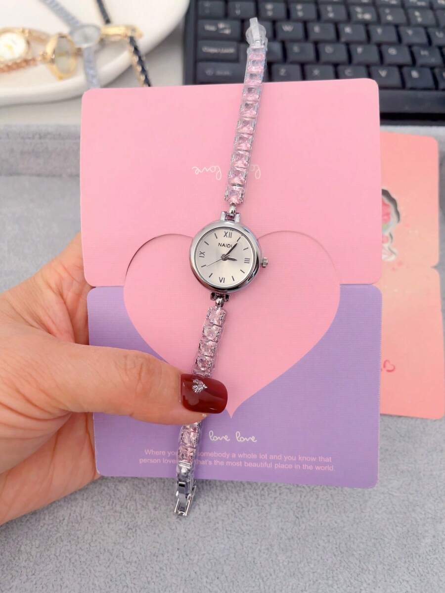 女士手链手表,粉色水晶石英表,适合日常佩戴、开学季、情人节礼物