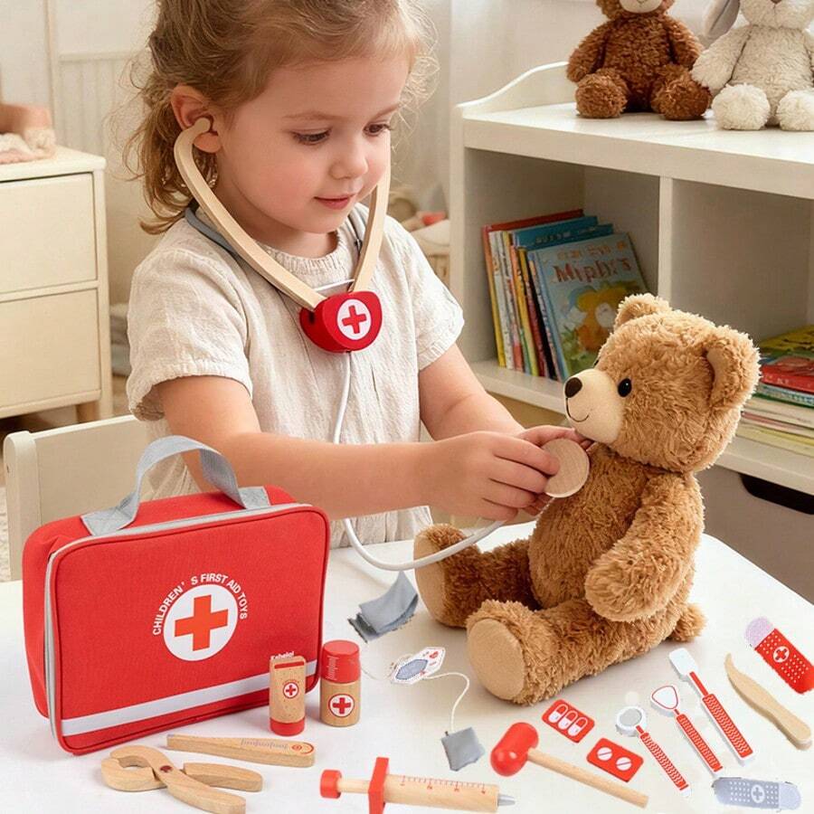 一套儿童角色扮演玩具,木制逼真医疗套装,医生护士游戏,含听诊器和体温计,儿童角色扮演益智玩具,家庭互动游戏