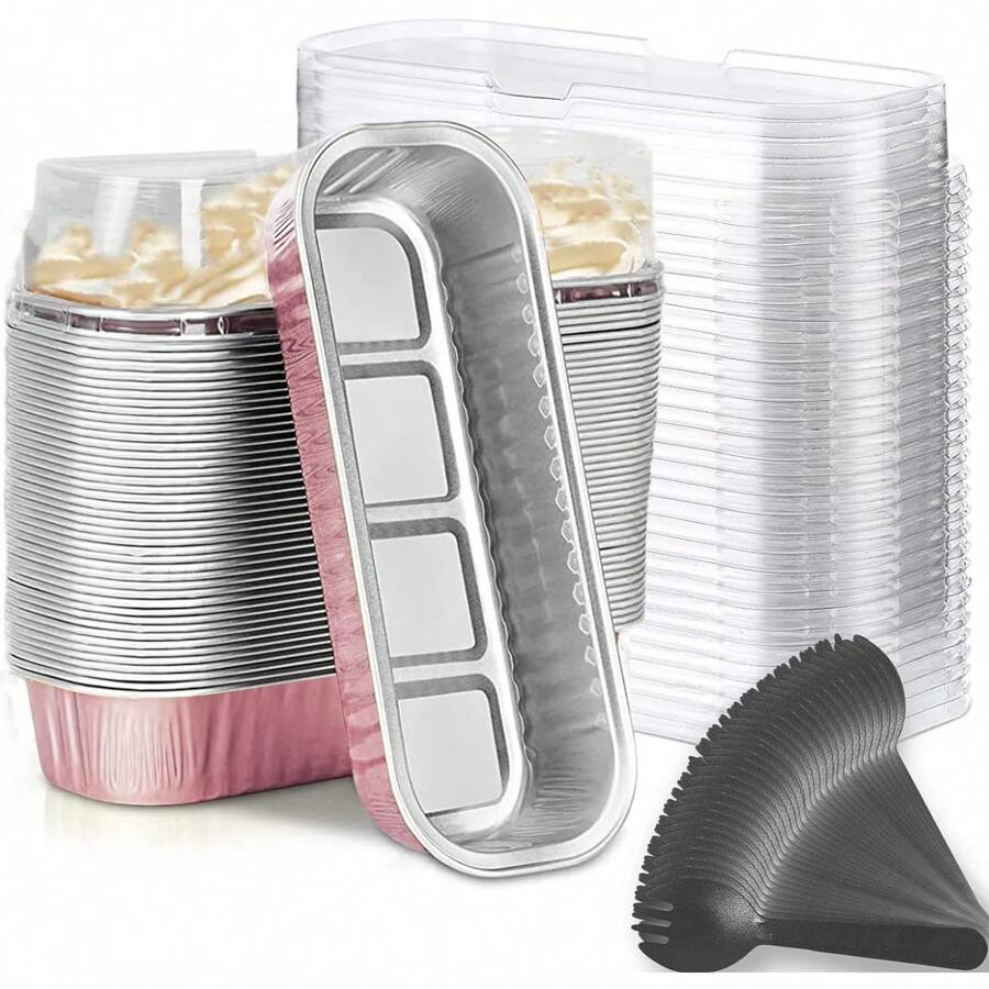 10/50 件迷你面包烤盘,带盖和勺子(6.8 盎司/200 毫升)迷你蛋糕盘,一次性矩形铝箔烤盘罐头容器 - 纸杯蛋糕容器包装纸芝士蛋糕焦糖布丁小模子