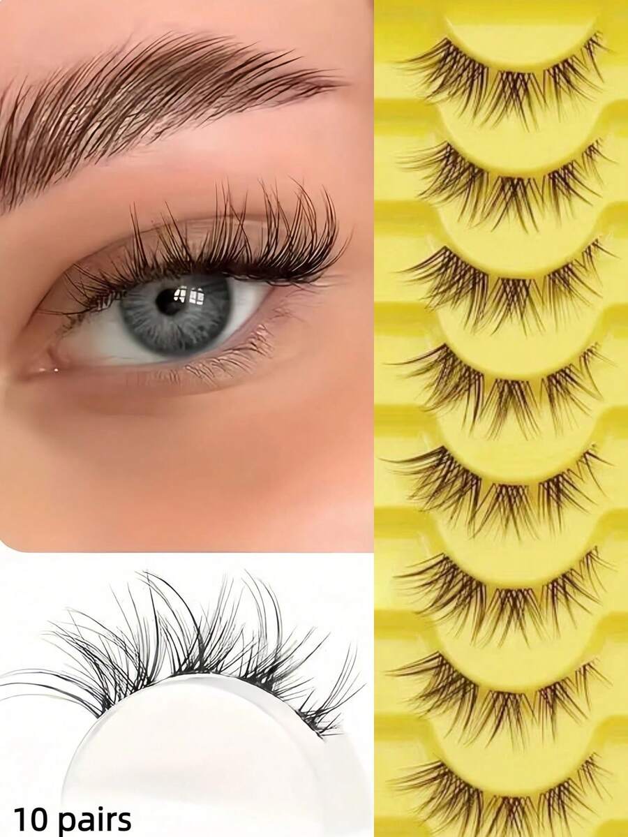 10对高评价狐狸毛假睫毛 - 自然妆效,猫眼妆,蓬松款式,D型卷度,0.07毫米粗,7-14毫米长,可重复使用,透明底膜,适合新手DIY假睫毛