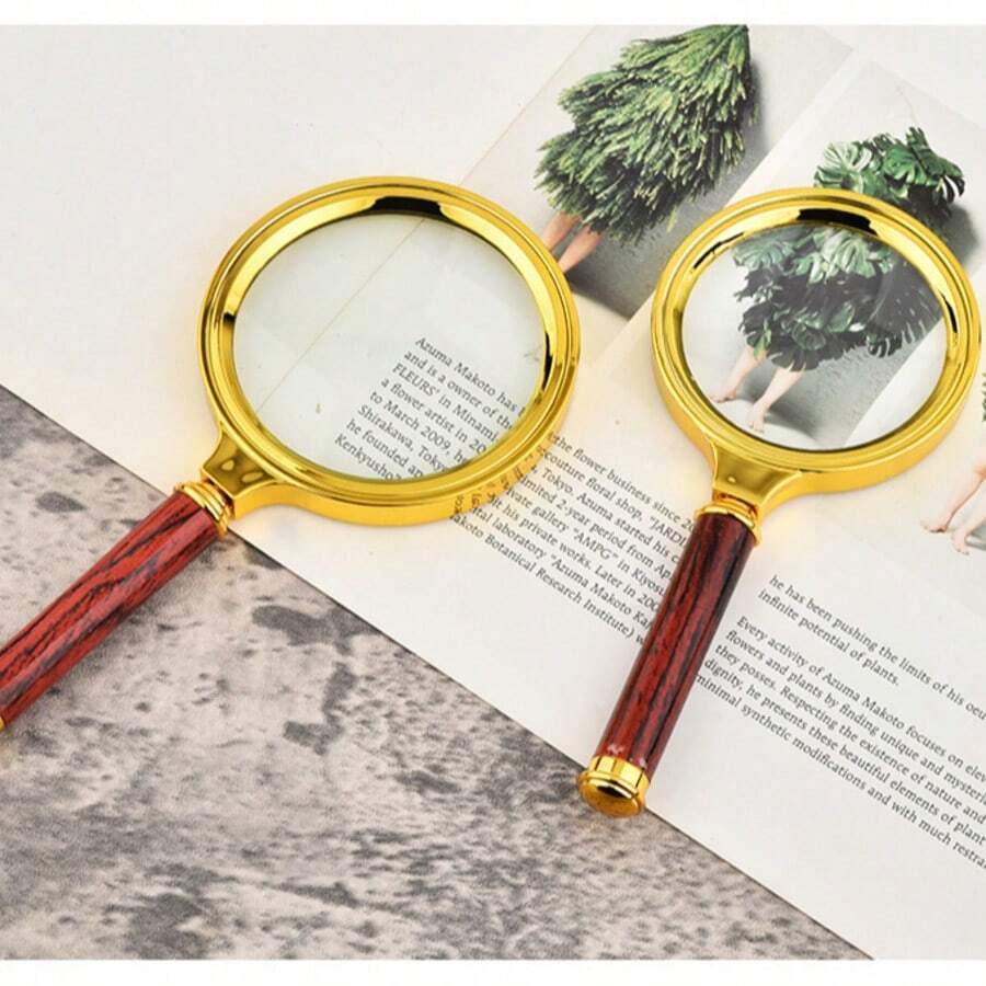10倍手持放大镜,60毫米/70毫米/80毫米/90毫米直径可选,仿木手柄,镀金,生日/毕业礼物