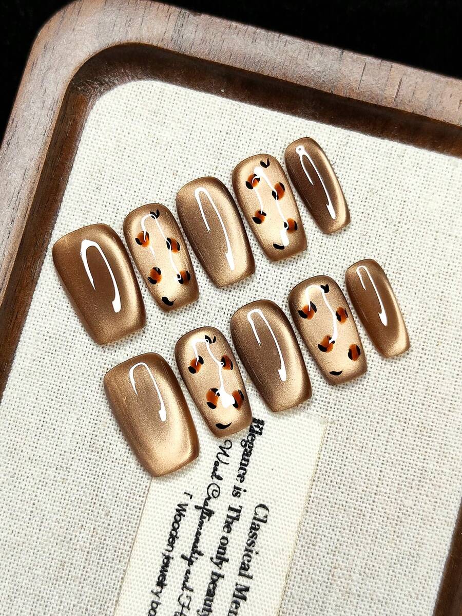 • 10片手工可佩戴美甲贴纸,按压式假指甲,圣诞节和万圣节礼物,猫眼渐变色,手绘豹纹,时尚高端,可重复使用,女孩必备礼物 - 棕色 - 查看 6