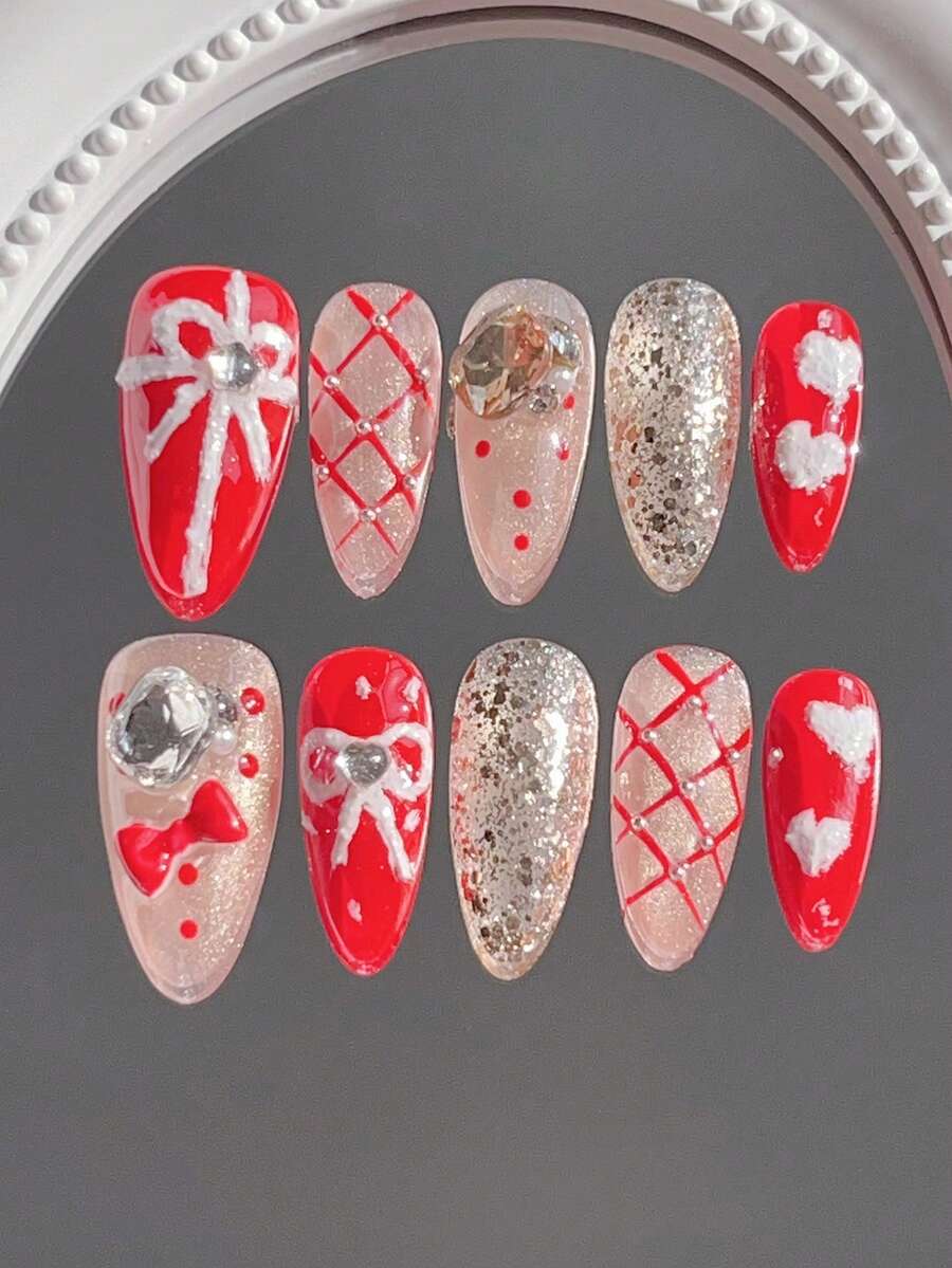 10片中长杏仁形美甲贴纸,手绘白色石膏3D蝴蝶结,可爱红色美甲贴花,手绘白色石膏心形美甲贴纸,手绘钻石图案带小钢珠,可爱杏仁形按压式美甲贴纸,适合新年、情人节、婚礼、约会等场合。