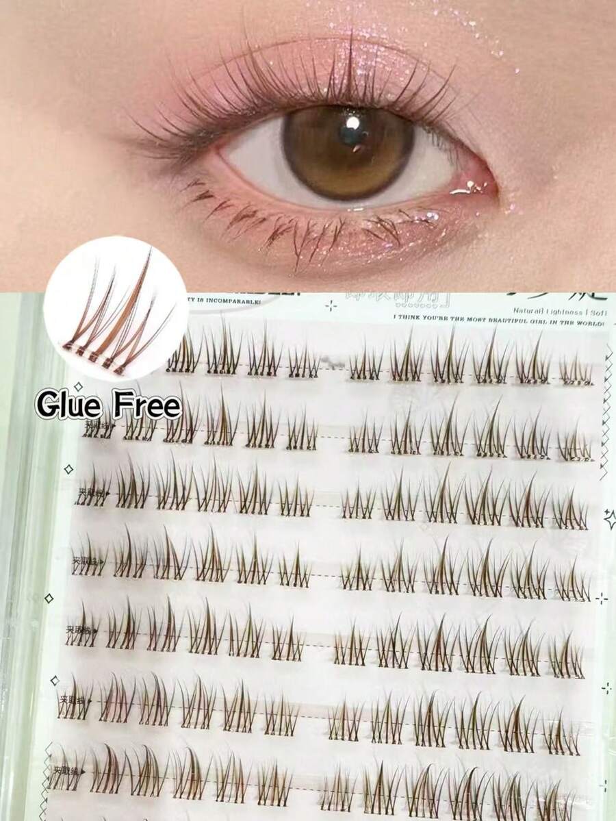 120 件焦糖棕色无茎向日葵无胶假睫毛,透明自然分段自粘 C 型卷睫毛