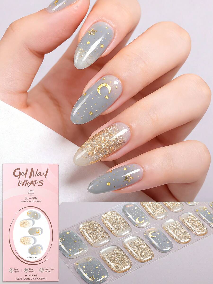 16片半固化凝胶美甲贴纸,优雅渐变星月闪粉美甲贴纸,适合秋冬季节,打造精致美甲,沙龙品质,时尚美甲用品,适合女性和女孩在假期、居家和约会中使用。