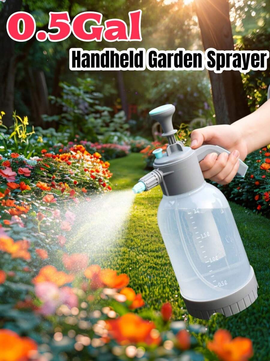 1个0.5加仑手持式花园喷雾器,2升泵式喷雾器,68盎司带安全阀的喷水瓶,可调节喷嘴,加长喷杆和备用密封圈,适用于浇水、施肥和清洁。