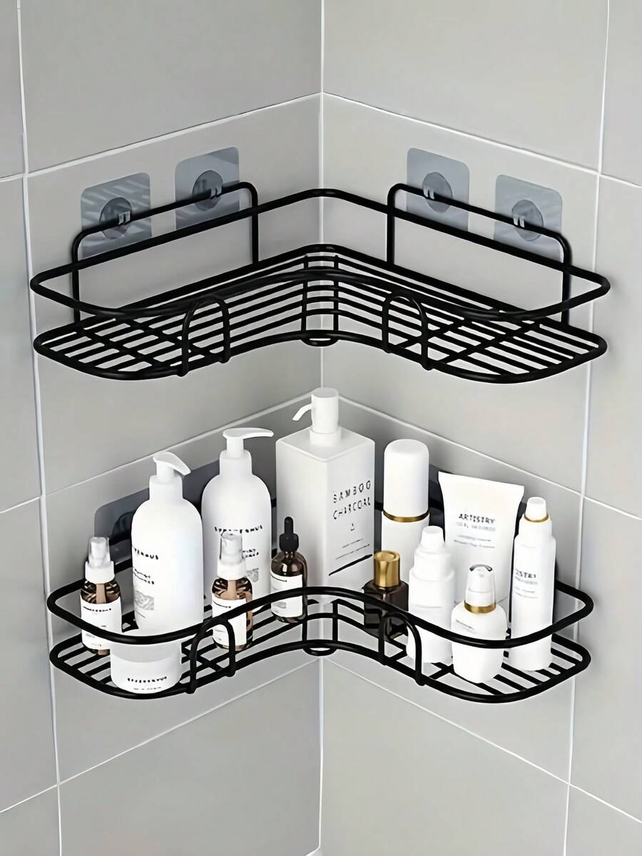 1个壁挂式浴室转角置物架,黑色金属三层收纳架,可放置洗漱用品、护肤品和清洁用品,粘胶安装,适用于淋浴房和盥洗台,非常适合小型浴室、出租房、节假日聚会(圣诞节、新年)——充分利用垂直空间,时尚美观,是整洁浴室的必备单品,也是家居收纳爱好者的理想礼物。#浴室转角置物架 #洗漱用品收纳架 #小型浴室解决方案 #租房友好 #家居收纳礼物