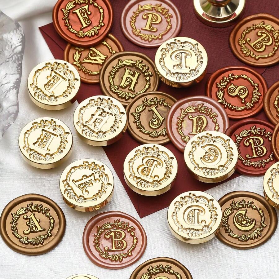 1个25毫米花环字母系列火漆印章头,26个英文字母黄铜铜头蜡封印章,复古工艺印章头,适用于卡片信封、婚礼请柬、礼品包装、返校、学校用品