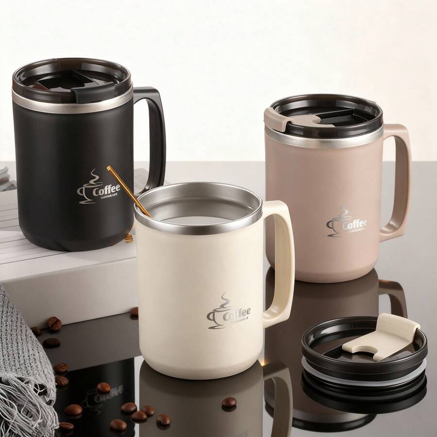 1个450/500毫升304不锈钢咖啡杯,带手柄和盖子,双层保温咖啡杯,防漏茶牛奶水杯,耐热饮水杯,适合学生和成人居家、学校、宿舍、办公室、户外露营、野餐、旅行、返校等场合使用。
