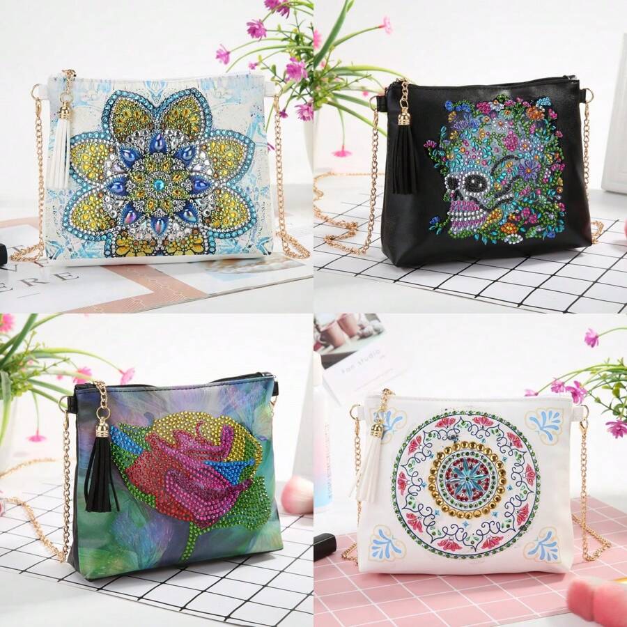 1 件 5D DIY 独特花卉图案钻石画套件斜挎包 - 带不对称钻石的 PU 皮革艺术手提包、拉链和链条单肩包、创意工艺礼品套装