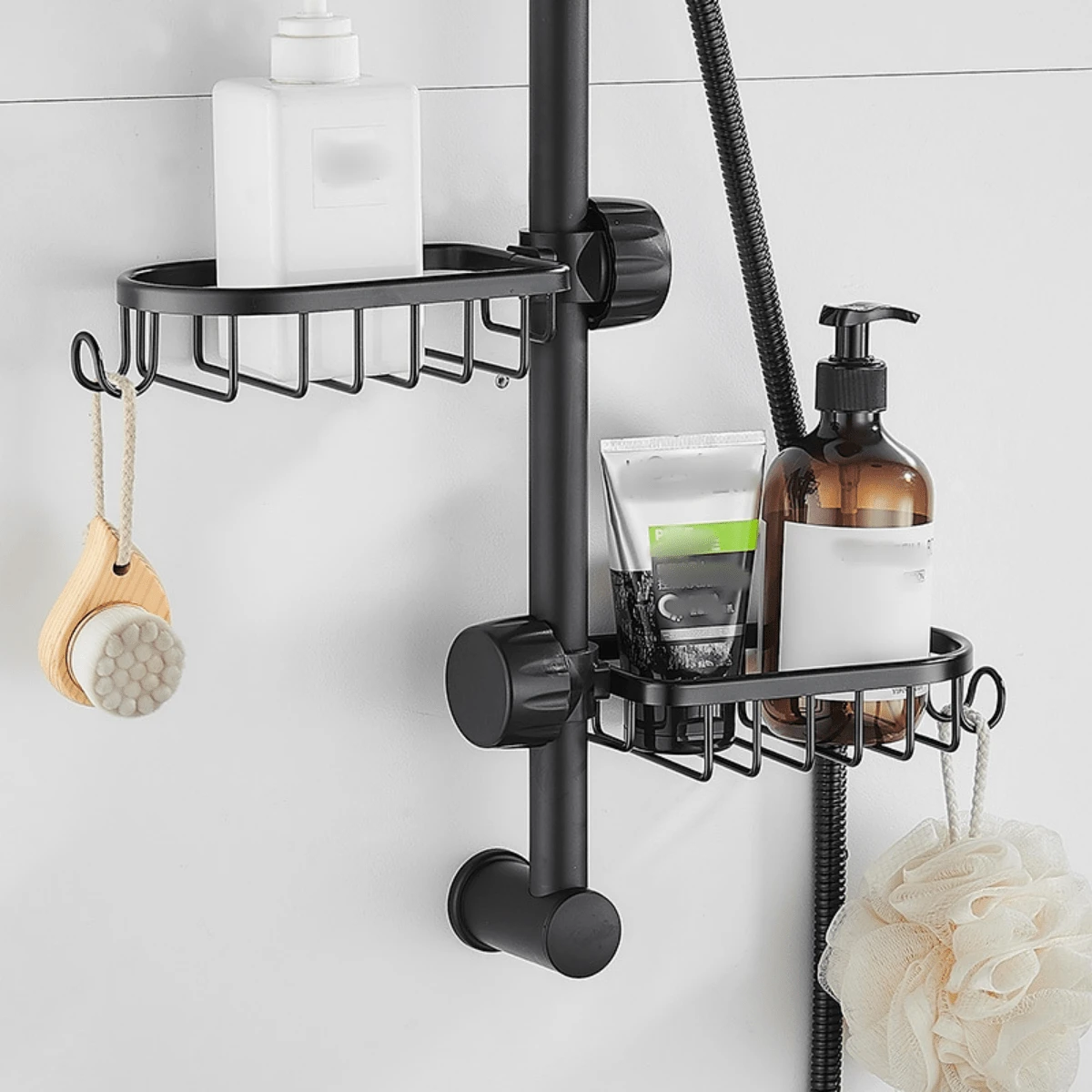 1个可调节浴室淋浴喷头支架,厨房水龙头收纳架,适用于浴室、厨房、餐厅,可放置沐浴露、洗发水、洗洁精、洗面奶、海绵等。