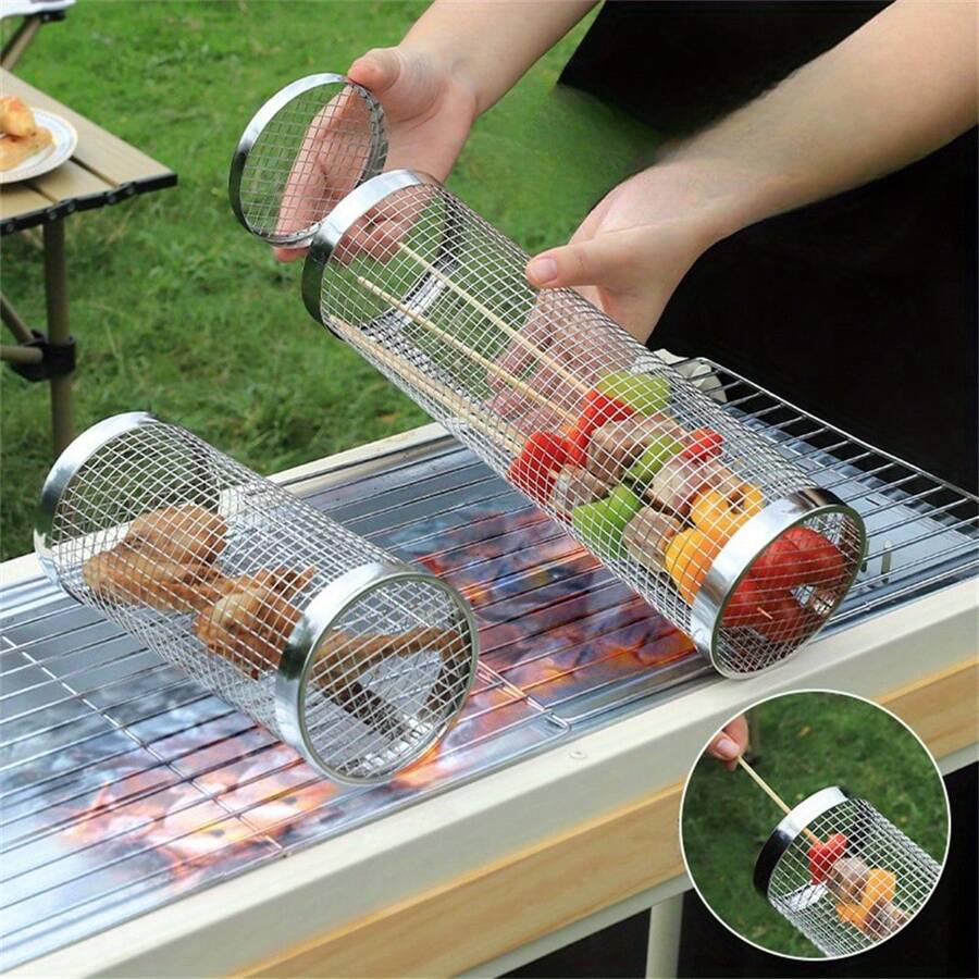 1 件,烧烤滚动烤篮不锈钢烤笼,圆形不锈钢烧烤架,适用于蔬菜鱼,户外野餐露营烧烤配件