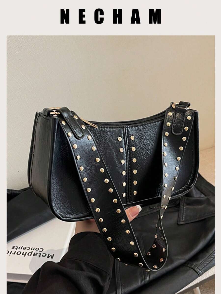 1 件时尚女士法棍包,软皮单肩包/斜挎包,朋克铆钉设计,可调节肩带,休闲日常使用包适合年轻女性 - 旅行、工作、购物、上学、约会、礼物、商务通勤、办公室
