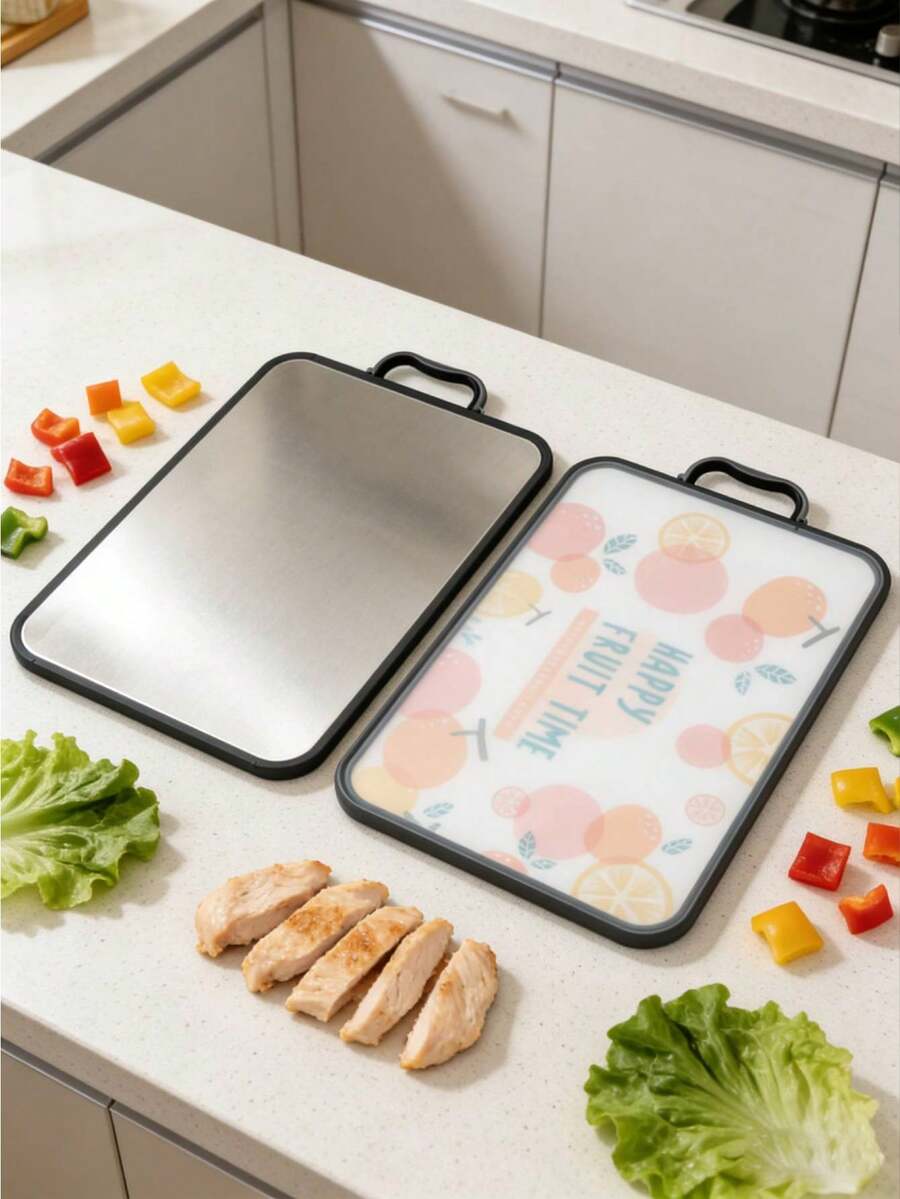1块趣味水果图案304不锈钢双面砧板,厨房解冻板,带导汁槽和防滑槽