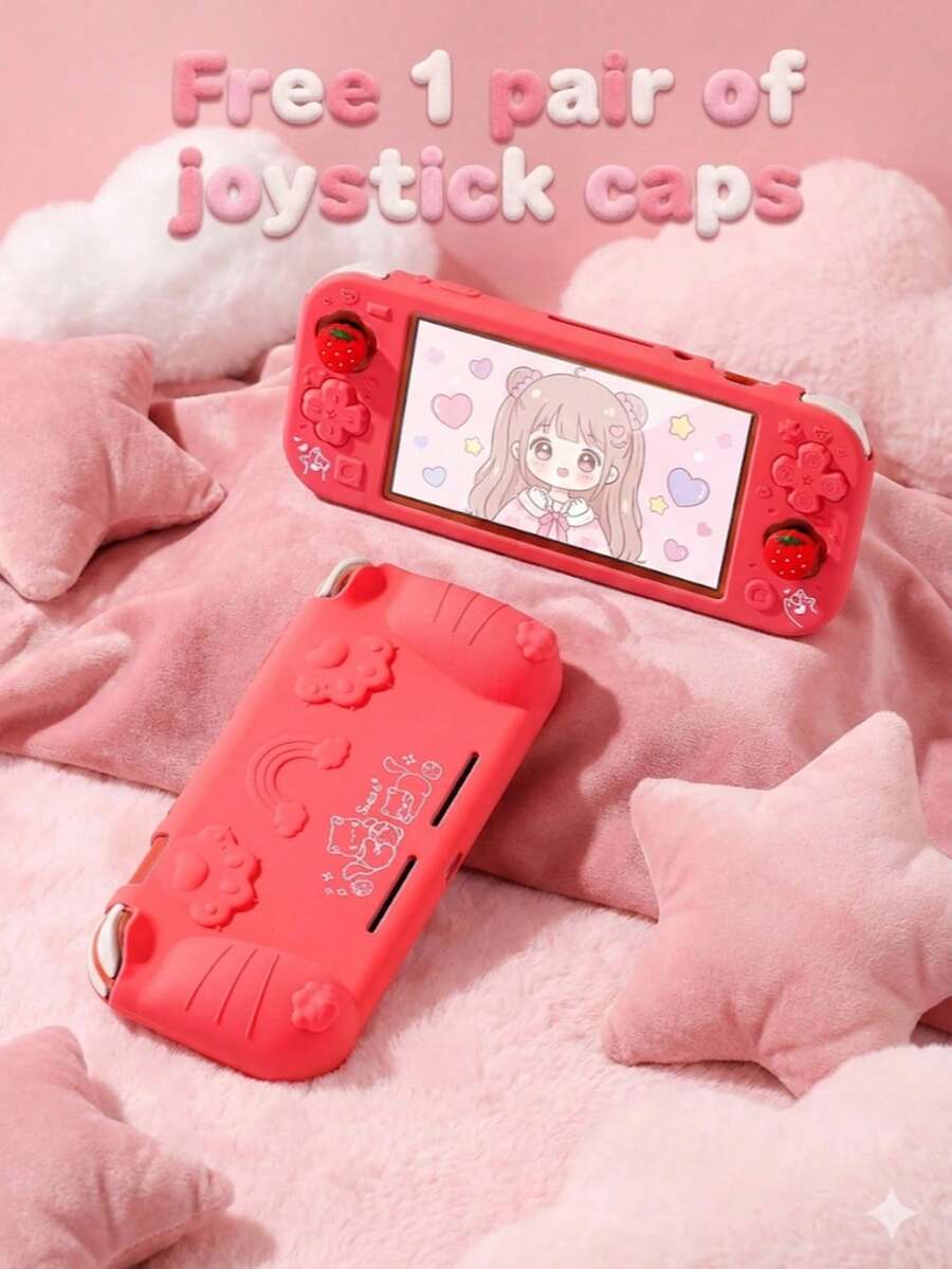 1个游戏机保护壳,防摔、防尘、防刮,增强握持感,符合人体工程学设计,适用于Lite机型,可爱的彩虹和爪印图案,包含2个摇杆帽