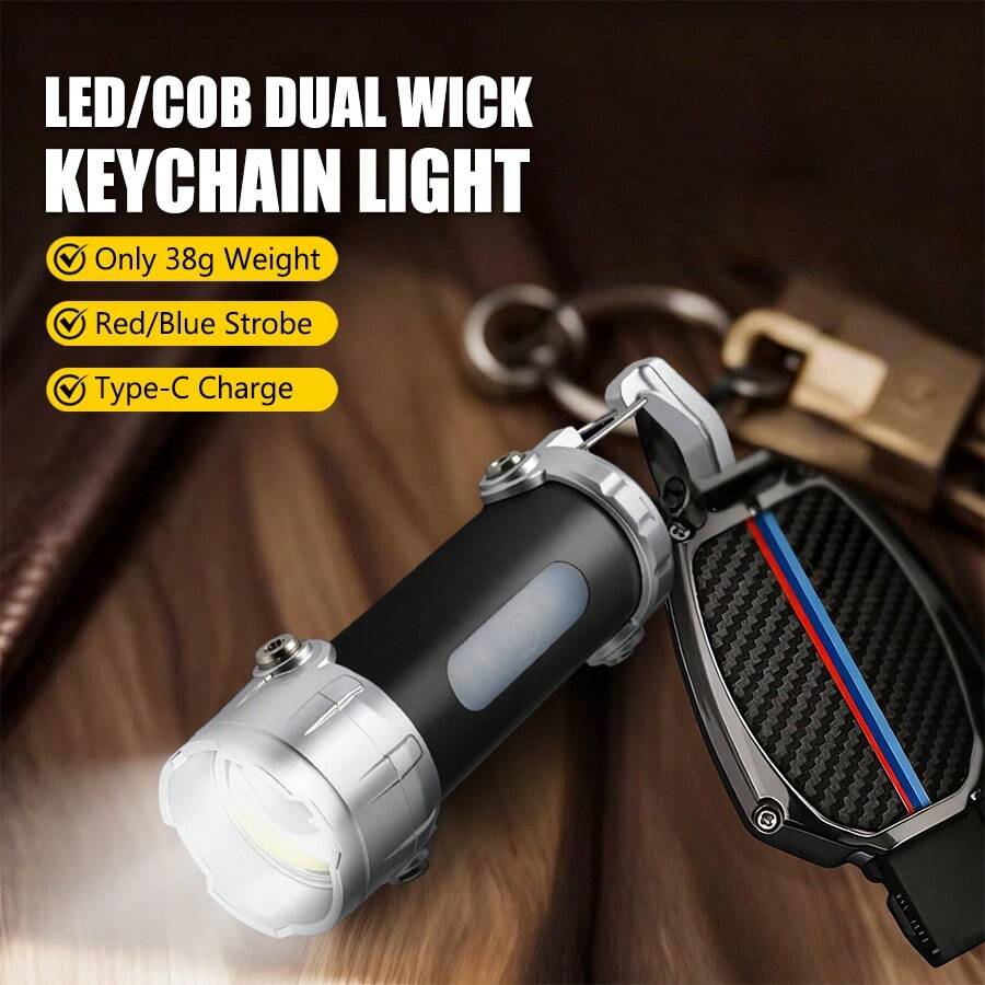 1个高流明手电筒,3种模式,Type-C快充,带红/蓝警示灯,便携式挂钩钥匙扣迷你灯