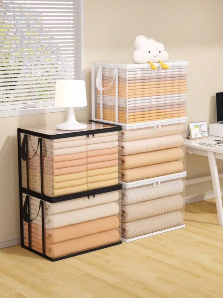 1个大容量PVC翻盖收纳袋,多功能防水书籍收纳袋,便携式可折叠衣物收纳袋,衣柜整理袋,PVC材质防尘防潮,带拉链,两侧带提手,可折叠节省空间,适合衣柜和房间整理。