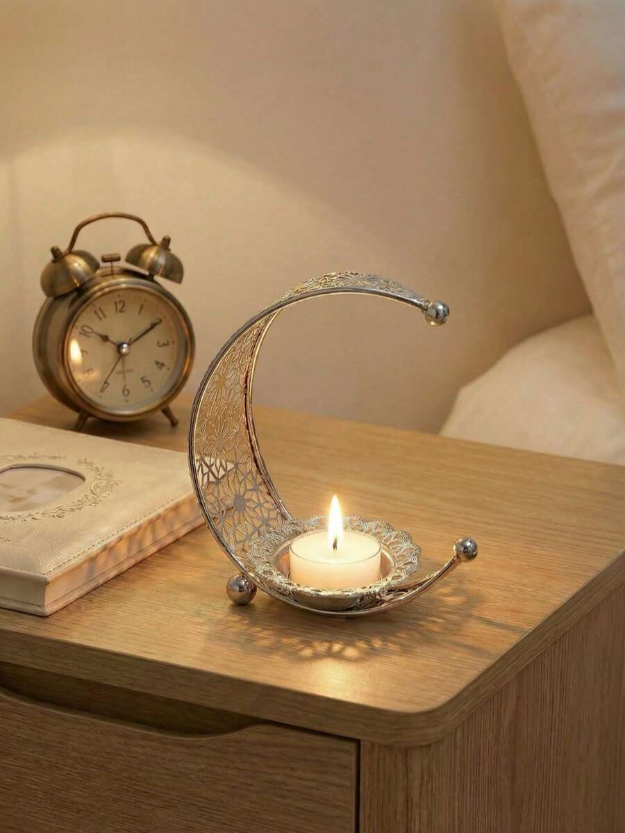 1个金属铁艺斋月烛台,现代欧式斋月装饰烛台,桌面家居装饰,带星星、月亮、灯笼图案的装饰烛台,适合斋月和开斋节使用。