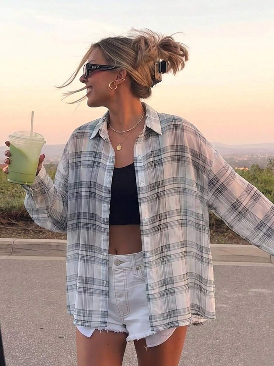 • 1件女士夏季格子长袖轻薄透气休闲衬衫,适合海滩、度假、日常穿着和约会。 - 白色 - 查看 6