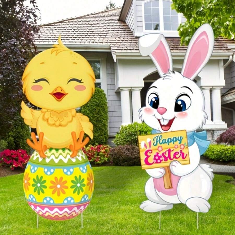 2 包复活节鸭子和兔子庭院装饰插牌,塑料材质,无需电源,适用于草坪和花园,3D 节日主题装饰
