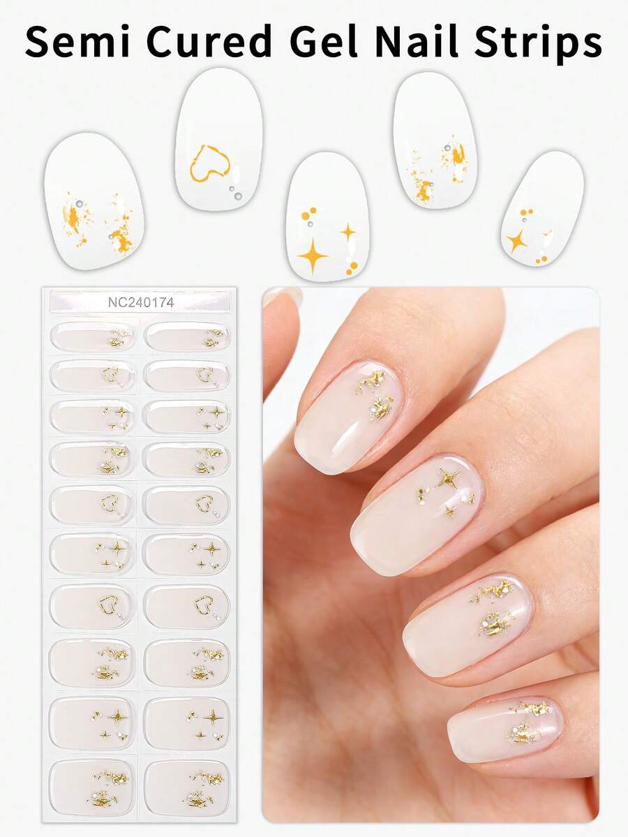 20片情人节爱心半固化凝胶美甲贴,春夏底白色指甲油搭配金色铬星爆水钻美甲贴纸,非常适合女士约会、派对和居家DIY美甲。