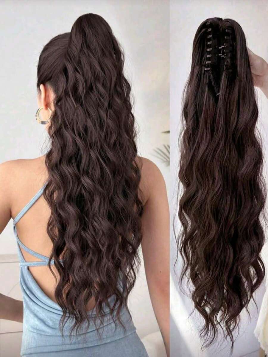26英寸深棕色水波纹耐热合成马尾假发,适合女性和女孩,日常及派对佩戴。