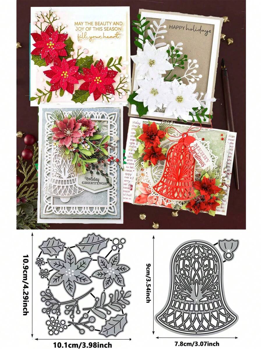 2 件圣诞主题红叶花和圣诞铃铛灰色金属模切,适用于剪贴簿装饰、DIY 剪贴簿纸工艺、压花工艺、手工工艺品和卡片制作、贺卡制作金属模切