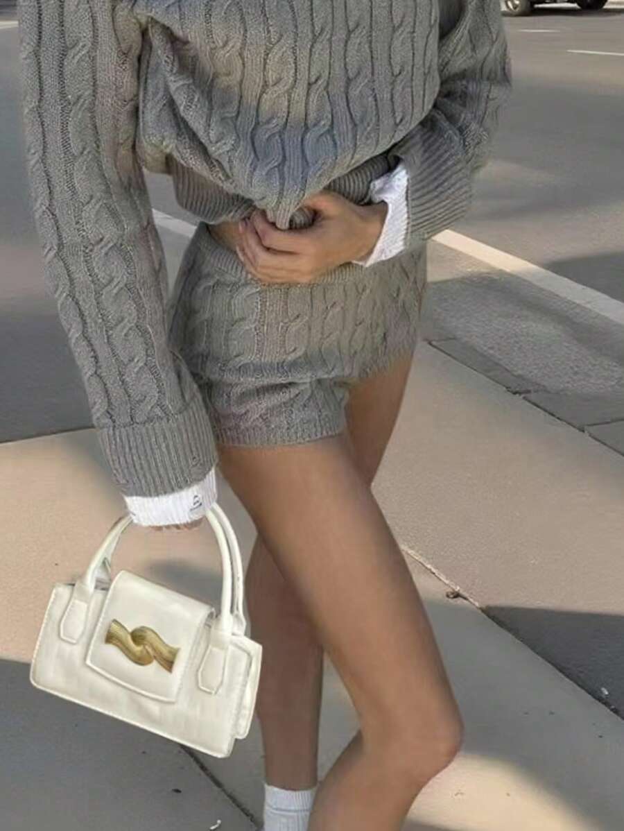 2件套纯色口袋套头衫和短裤,休闲秋冬装,返校,女教师制服,女士外出上衣,女士约会夜装,女士商务休闲低腰,韩版风格,基本款撞色毛衣,万圣节毛衣,圣诞节毛衣,女士办公室装,秋冬女士厚针织毛衣和短裤套装,温暖罗纹两件套