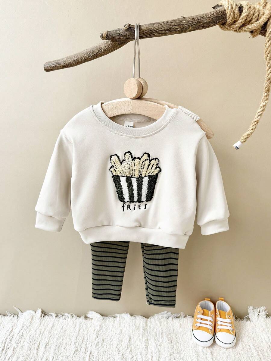 2 件套幼儿男孩/女孩米色休闲薯条刺绣长袖 T 恤 + 长裤,春秋