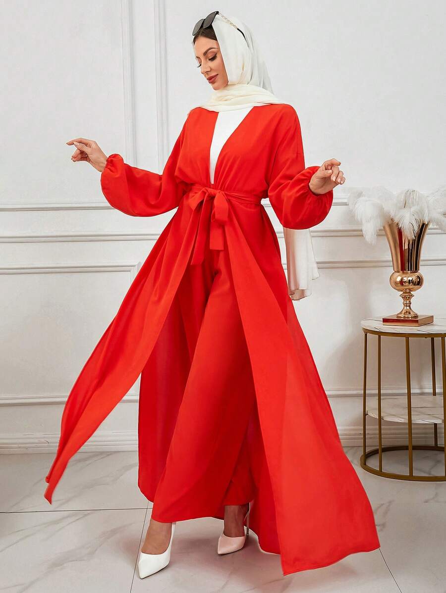 2 件/套纯色重叠 V 领落肩长袖土耳其和阿拉伯传统长袍和裤子,朴素长袍套装,度假装,海滩度假装