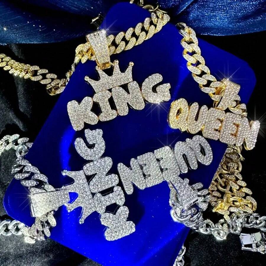2 套嘻哈情侣首饰 - 锌合金闪亮水钻国王和王后字母吊坠休闲风格搭配冷酷链是送给男朋友和女朋友的理想新年礼物