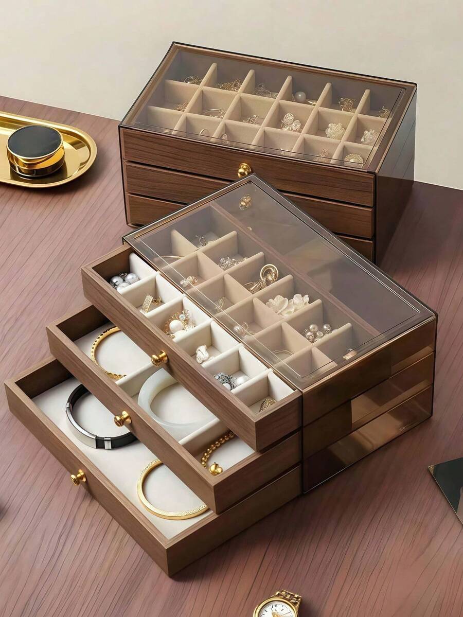 三层首饰盒,木质首饰收纳盒,亚克力首饰整理盒,复古风格首饰盒,抽屉式首饰盒,化妆品收纳盒,首饰展示整理盒,可展示戒指、耳环、项链、手镯,母亲节礼物,伴娘礼物,生日礼物,送给朋友和老师的礼物,女士理想礼物
