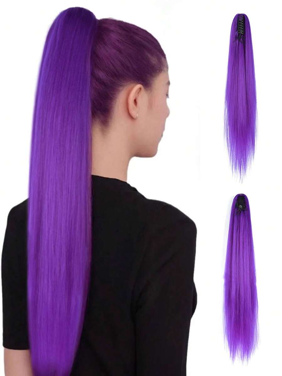 • 32英寸长马尾假发,长直马尾夹式爪形假发,自然逼真合成假发,女士深紫色耐热纤维夹式马尾假发 - 紫色 - 查看 2