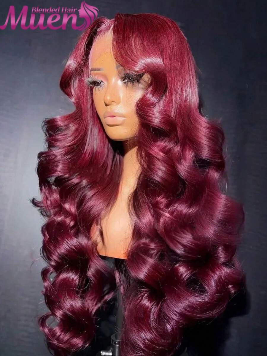 34英寸 13X4 透明蕾丝高清蕾丝前假发,带婴儿发,#99J 酒红色水波纹人发混纺假发,预先拔毛,漂白发结,200% 密度