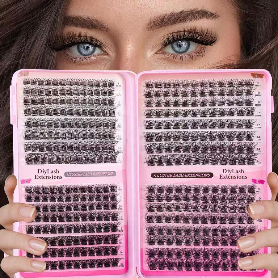 384片自粘式蓬松混合长度假睫毛套装,无需胶水,蓬松单根假睫毛,自粘式DIY睫毛嫁接,预粘睫毛簇,自然纤长C型卷翘假睫毛簇,无需胶水或卸除,假睫毛
