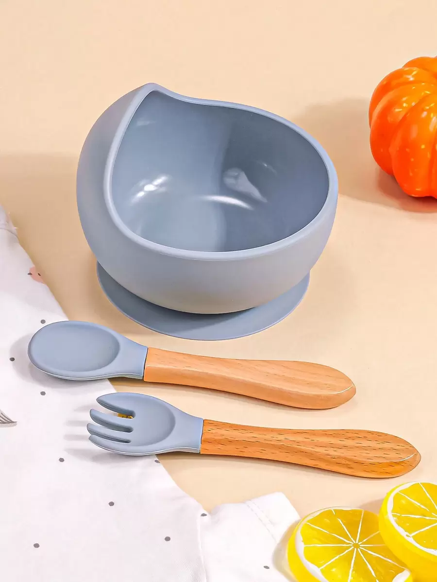 3入組嬰兒餵食餐具套裝 - 帶有吸盤底的矽膠碗和木柄匙叉,易於清潔,適用於日常使用和戶外活動的兒童餐具