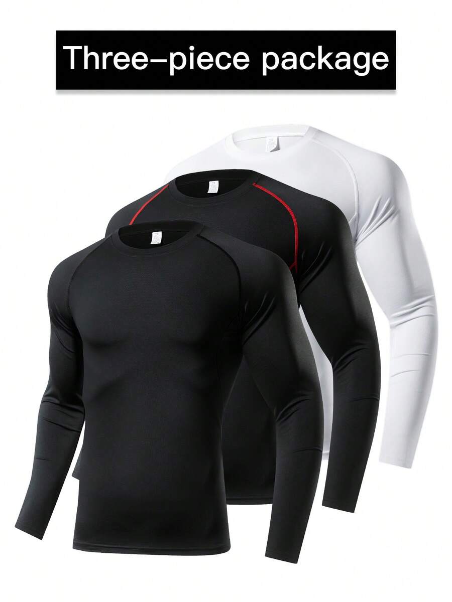 3件装男士长袖压缩运动T恤,透气速干健身上衣,吸湿排汗打底衫