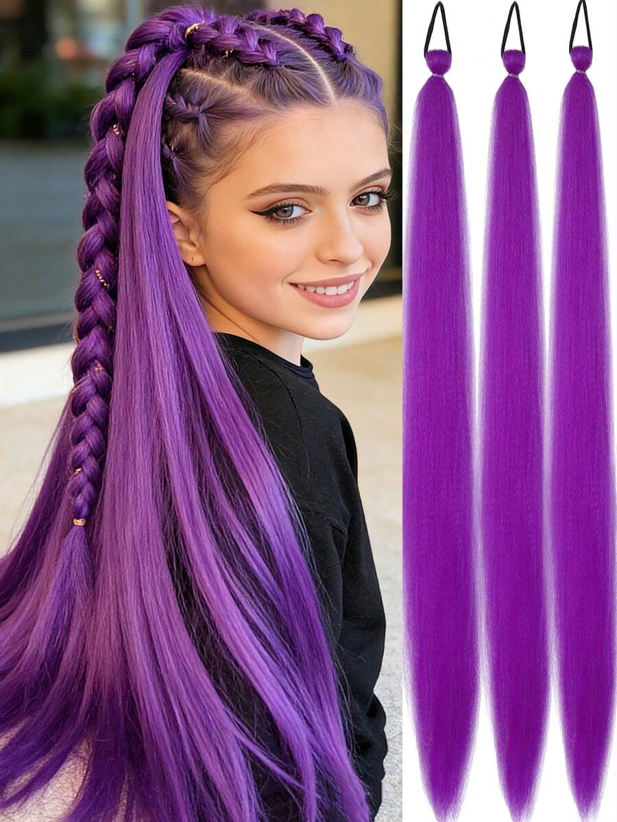 3条/包 26英寸红紫色编织假发,带松紧带,女士夹式接发,合成渐变色编织马尾辫