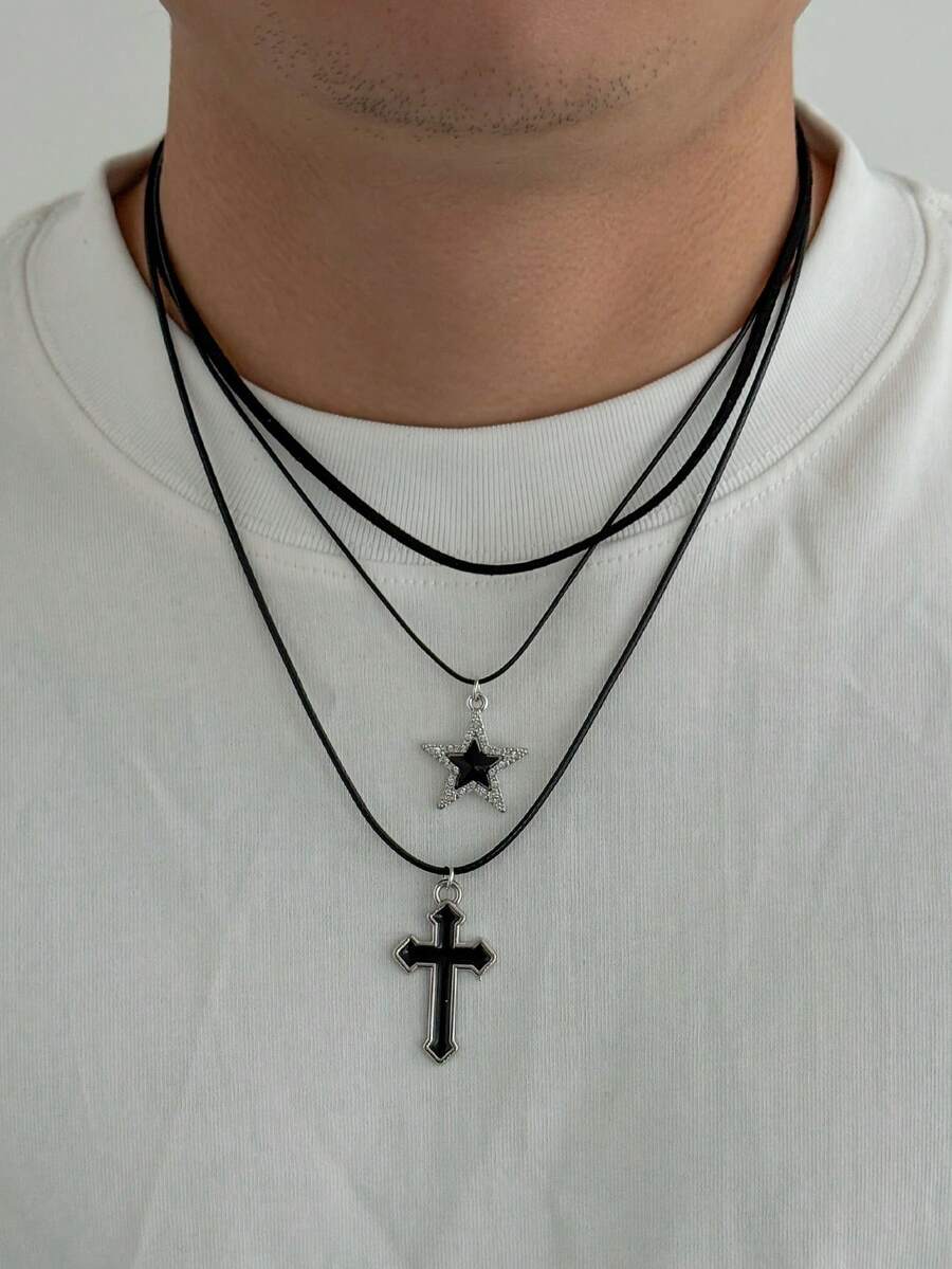 3件套哥特式几何蜡线十字架及水钻五角星吊坠项链,朋克嘻哈风,适合度假、派对、休闲、街头、婚礼、摇滚、情侣、节日、生日等场合,百搭礼物