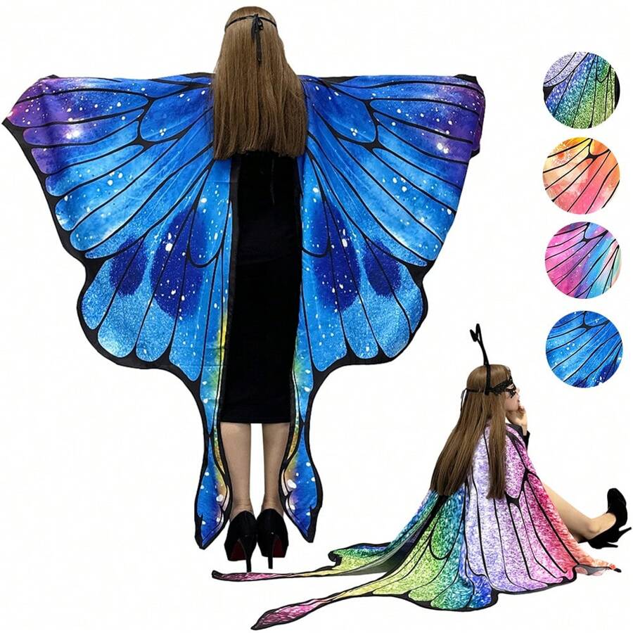 3 件/套女士蝴蝶尾翼披肩 + 头饰 + 面具、万圣节服装配饰套装、节日服装配饰蝴蝶印花披肩、天线头饰、蕾丝镂空面具、带蝴蝶翅膀的成人圣诞派对服装、头饰和面罩、生日礼物,适合派对、角色扮演、舞台表演、音乐节等。