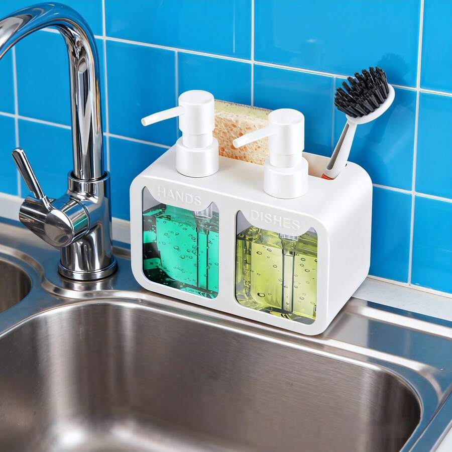 四合一厨房台面皂液器套装,带海绵架和刷架,包含洗手液和洗洁精瓶,现代家居装饰清洁工具