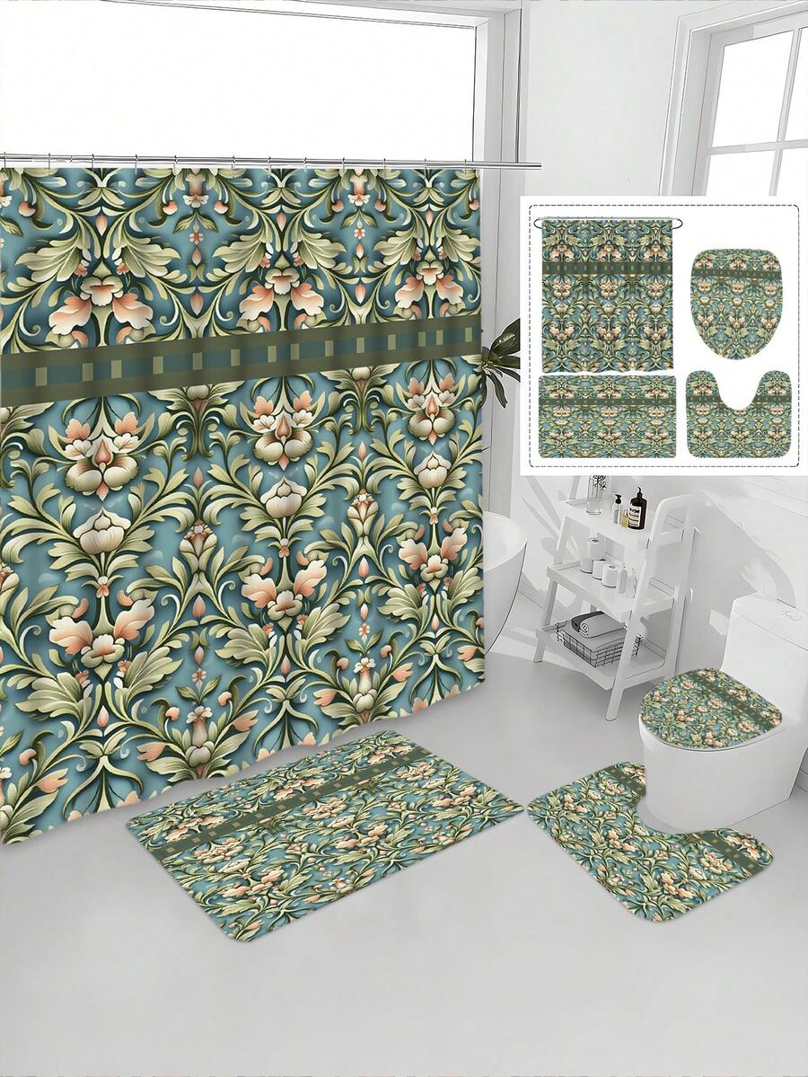 四件套绿色花卉浴室套装,包括浴帘、地垫、U型马桶垫、马桶盖套、防水浴帘、现代风格浴室隔断帘,无需钻孔,涤纶材质,可机洗