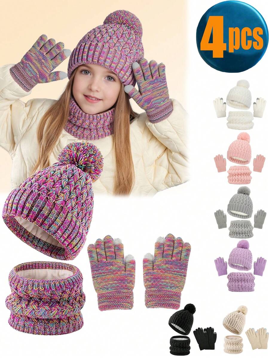 4 件套儿童针织绒球冬帽、围巾和手套套装,女童男童幼儿保暖针织连帽围脖套装