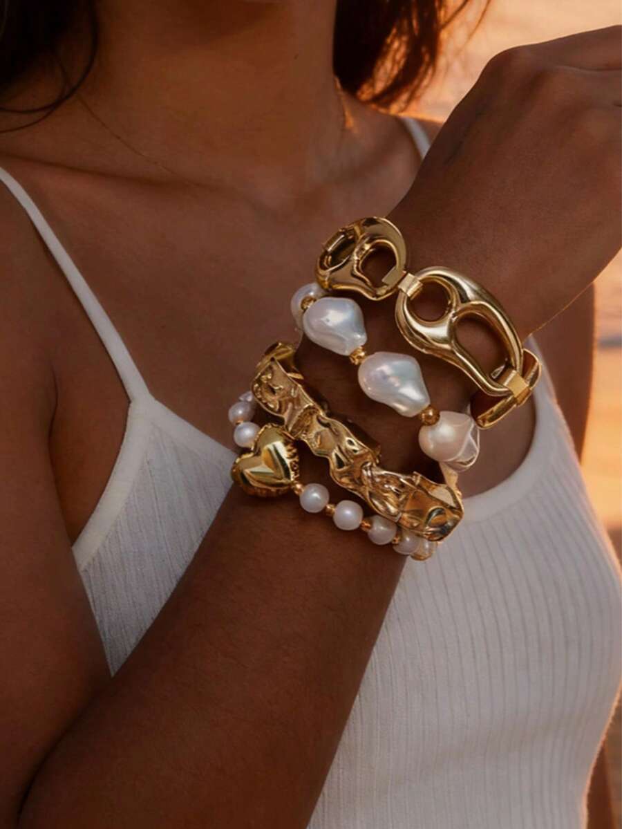 4件套时尚欧美多层CCB心形树树脂不规则珍珠手链手镯首饰套装,适合作为沙特派对的珠宝礼物