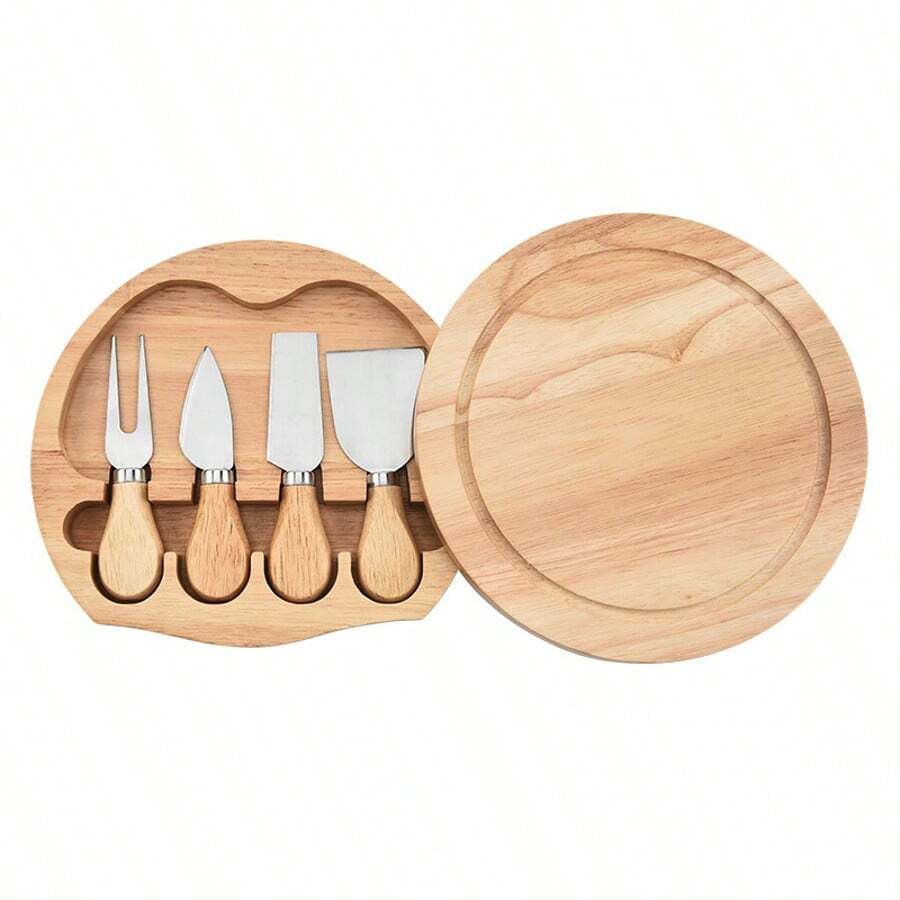 4件套不锈钢木柄奶酪刀套装,圆形橡胶木盒,烘焙工具