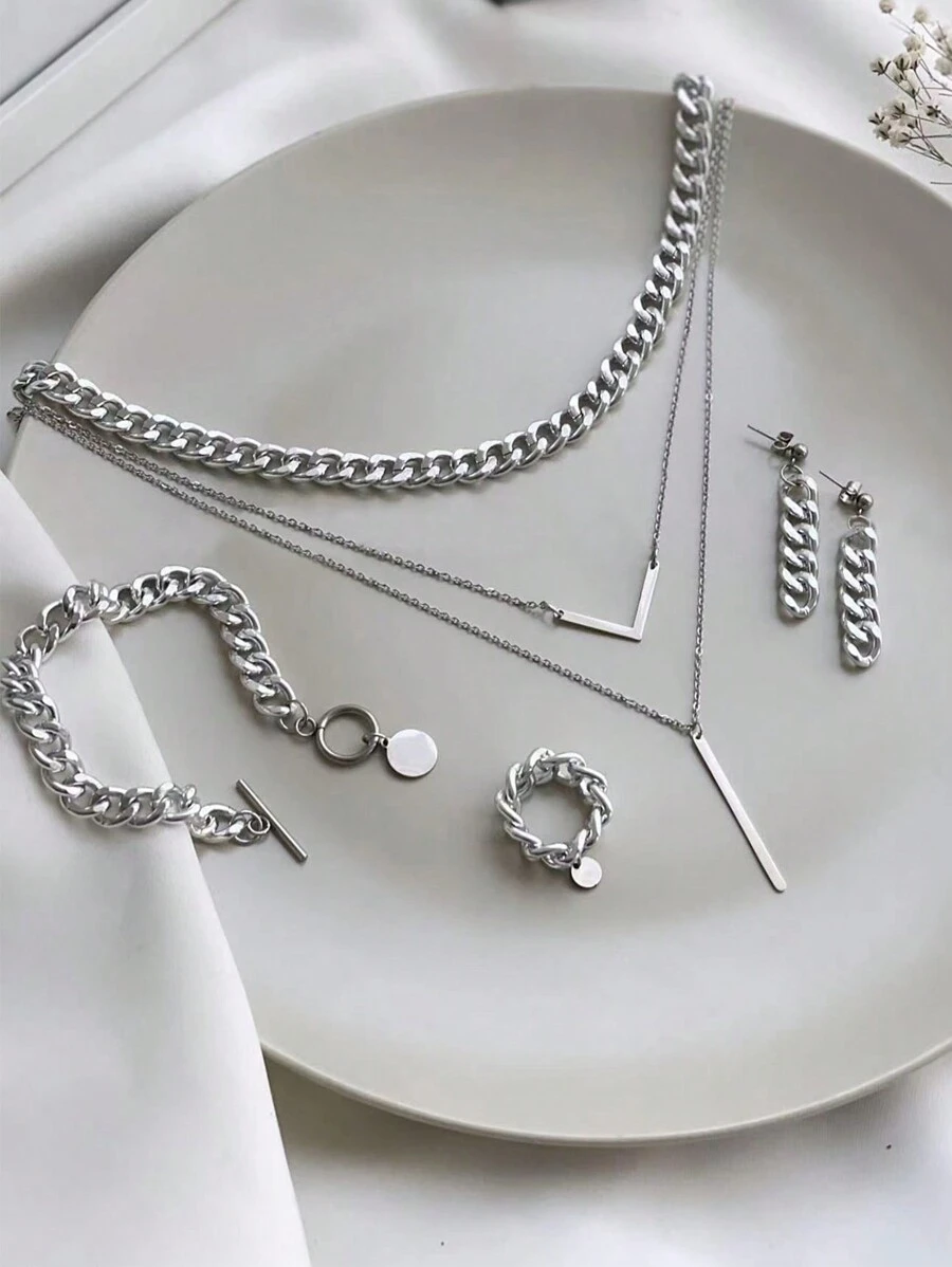 5 件裝簡約合金手鍊、耳環、項鍊、戒指和分層項鍊套裝