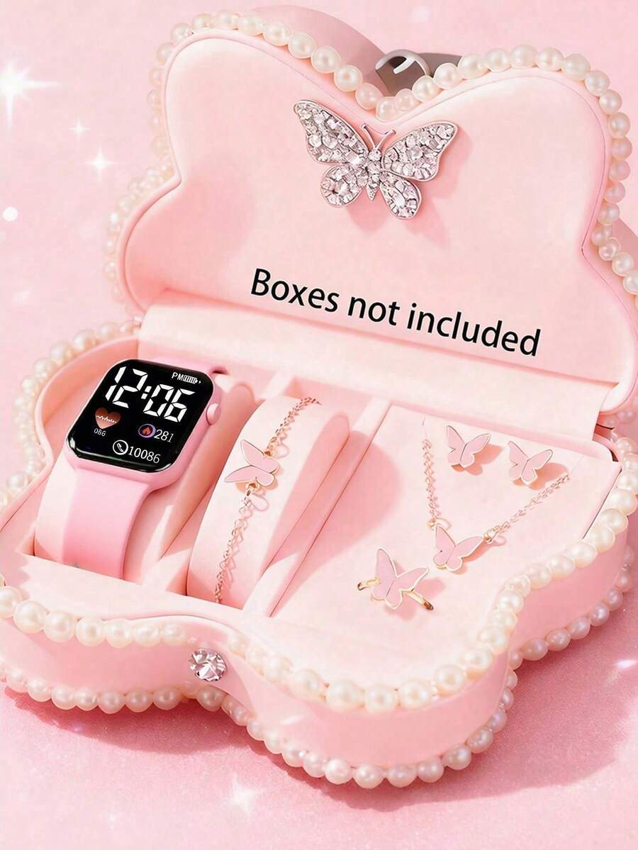 6/1 优雅女孩精致时尚心形图案电子手表,适合女孩佩戴。可搭配蝴蝶首饰套装,如项链、手链、戒指和耳环。